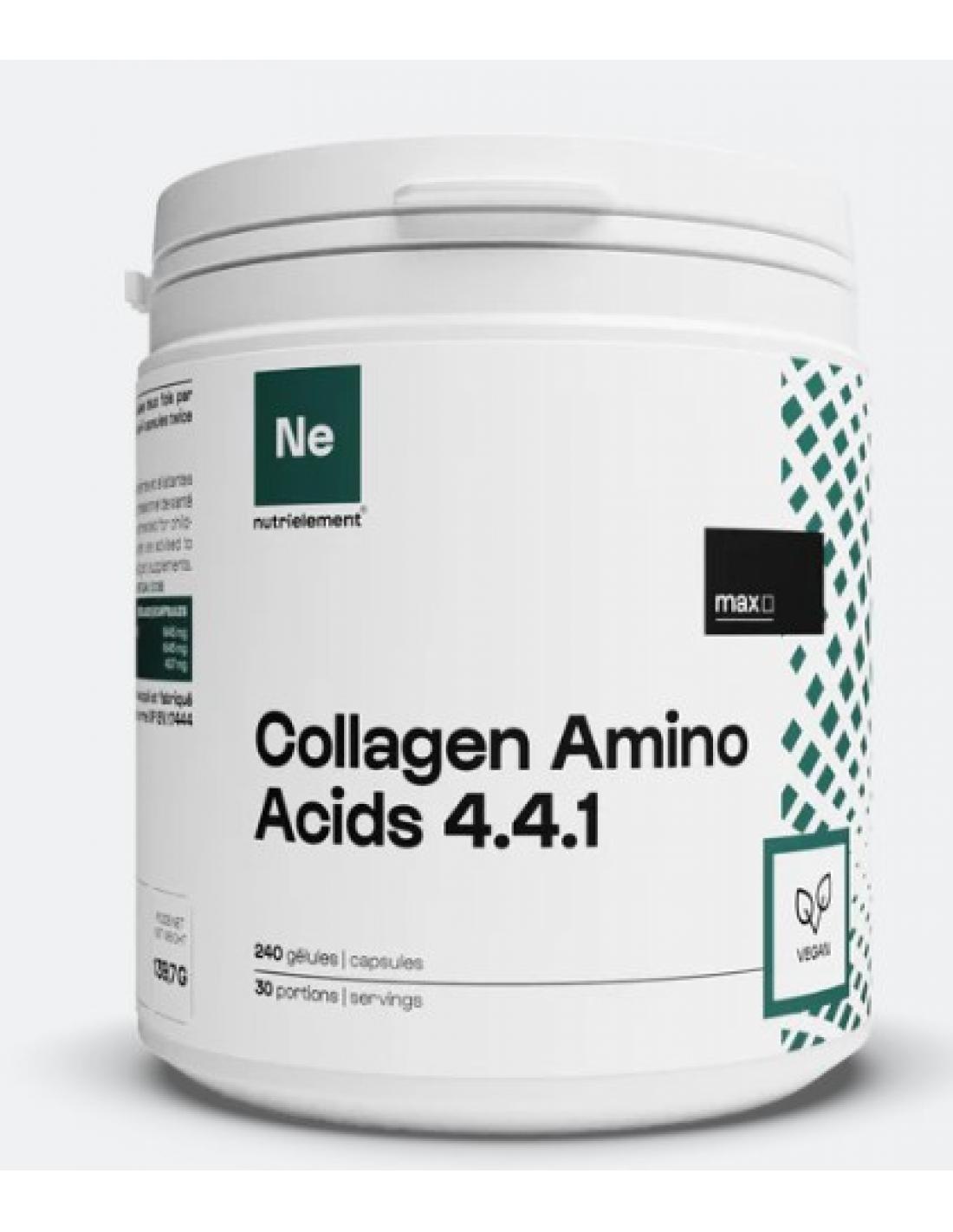 Nous vous recommandons d'associer les Acides Aminés du Collagènes 4.4.1 Nutrimuscle avec tous nos collagènes, la chondroïtine sulfate, la N-actéylglucosamine, la vitamine C, toutes nos protéines, la kératine Cynatine FLX Nutrimuscle.